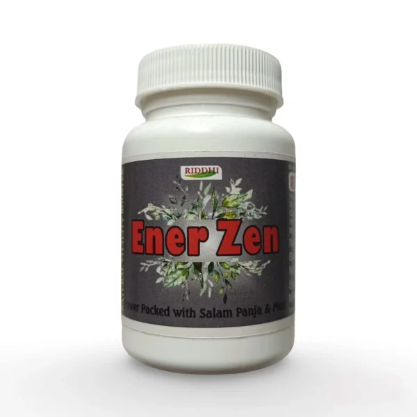 Ener Zen is a premium Ayurvedic vitality tablet formulated with rare and time-tested herbs including Salam Panja, Ashwagandha, Kali Musli and Shatavari, designed to support daily energy, physical strength, mental focus and overall wellness.